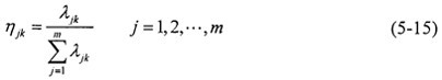 對(duì)象矩陣進(jìn)行聚類,聚類類別選為“1”、“2”、“3”三類,其白化函九分別與式(5-12)~(5-14)和圖5-4對(duì)應(yīng),F(xiàn)以f1為例,說(shuō)明求得白化函數(shù)閾值的方法。對(duì)應(yīng)象矩陣中的第一列,d(max)=1;d(mean)=0.917,取0.9,d(min)=0.8621,取0.86。因此,對(duì)于灰類1,有x1=0,x2=1;對(duì)于灰類2,有x1=0,x2=0.9,x3=2×x2=1.8;對(duì)于灰類3,有x1=0.86,x3=2×x1=1.72。同理可求出其余各分目標(biāo)各類白化權(quán)的閾值,代入式(5-12)~(5-14)中求出各類白化權(quán)函數(shù)及其值。按式(5-15)求出標(biāo)定聚類權(quán)矩陣η