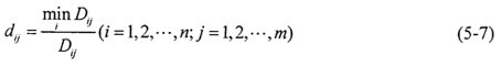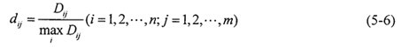 2.求轉(zhuǎn)換樣本矩陣 即象矩陣 由于指標(biāo)不同,要求不同,因此有必要按上限效果測(cè)度、下限效果測(cè)度、中心效果測(cè)度來(lái)統(tǒng)一樣本。當(dāng)指標(biāo)要求“越大越好”時(shí),可用上限效果測(cè)度,記統(tǒng)一后的樣本為dij,則有