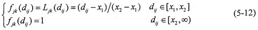 4.進(jìn)行灰色聚類 對(duì)象矩陣進(jìn)行聚類,聚類類別選為“1”、“2”、“3”三類時(shí),其白化權(quán)函數(shù)分別與式(5-12)~(5-14)和圖5-4對(duì)應(yīng)。