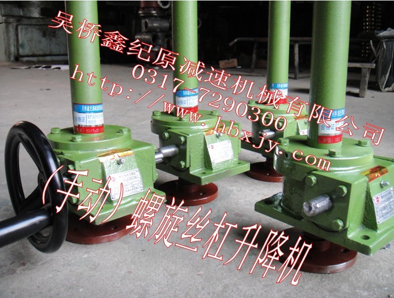 螺旋絲杠升降機是一種基礎起重部件,符合JB/T8809—1998原QWL蝸輪絲杠升降機符合(JB/ZQ4391—86)標準。該產品可廣泛用于機械、冶金、建筑、化工、醫(yī)療、文化衛(wèi)生等各個行業(yè)。承載能力2.5—120T。具有結構緊湊、體積小、重量輕、動力源廣泛、噪音小、安裝方便、使用靈活、功能多、配套形式多、可靠性高、使用壽命長等優(yōu)點。具有提升、降落、推進、翻轉等功能,可以單臺或組合使用。能按一定程序準確地控制調整提升或推進的高度,可以用電動機或其它動力直接帶動,也可以手動。最高輸入轉速1500r/min,最大提升速度2.7m/min。有不同的結構型式和裝配方式,提升高度按用戶的要求制造。該裝置可以自鎖,QWL蝸輪絲杠升降機" target=_blank>絲杠升降機是一種基礎起重部件,其符合JB/Z04391-86標準,是將蝸輪減速器和絲杠螺母副等巧妙地結合在一起組成的一個運動組合單元。它既可以單獨使用,又可以象拼積木似地通過聯(lián)接件快捷組合,實現(xiàn)物體的升降、往復、翻轉等運動。 QWL蝸輪絲杠升降機作為一種功能部件已被廣泛應用于各行各業(yè)。例如:機械行業(yè)的傳動裝置、數(shù)控執(zhí)行裝置;冶金行業(yè)的軋輥運動裝置、煉鋼廠鋼包提升和翻轉裝置以及人所不能及的場所的運動傳遞裝置;鐵路車輛行業(yè)的車輛舉升架,大型柔性夾緊、轉位工裝、焊接機器人等;建筑行業(yè)的舉升裝置、大型門窗自動或遙控開啟裝置;水利等行業(yè)用閘門的開啟裝置、雷達及太陽能遙感裝置;醫(yī)療器械、升降舞臺及汽車制造業(yè)的舉升裝置;以及航空航天、國防軍事的傳動裝置等等。事實上,蝸輪絲杠升降機幾乎可以在任何需要實現(xiàn)機械位移傳的地方使用。