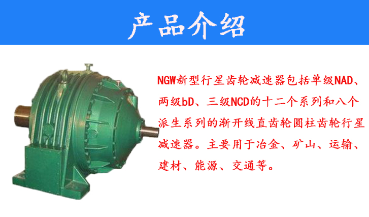 NGW新型行星齒輪減速器包括單級(jí)NAD、兩級(jí)bD、三級(jí)NCD的十二個(gè)系列和八個(gè)派生系列的漸開線直齒輪圓柱齒輪行星減速器。主要用于冶金、礦山、運(yùn)輸、建材、能源、交通等。