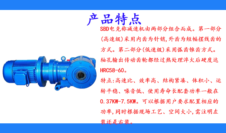 SBD電克稱減速機(jī)由兩部分組合而成。第一部分(高速級)采用內(nèi)齒為針銷,外齒為短幅擺線齒的方式。第二部分(低速級)采用弧齒錐齒方式。軸孔輸出傳動(dòng)齒輪都經(jīng)過熱處理淬火后硬度達(dá)HRC58-60。