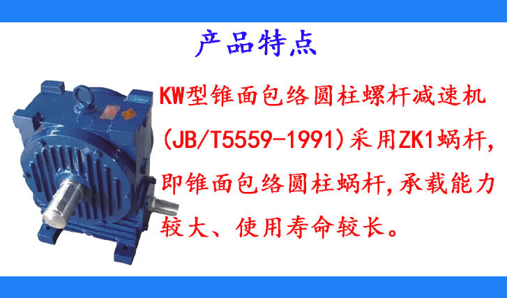 KW系列錐面包絡圓柱蝸桿減速器(JB/5559-1991)采用ZK1蝸桿,即錐面包絡圓柱蝸桿,承載能力較大,傳動效率高,使用壽命長。