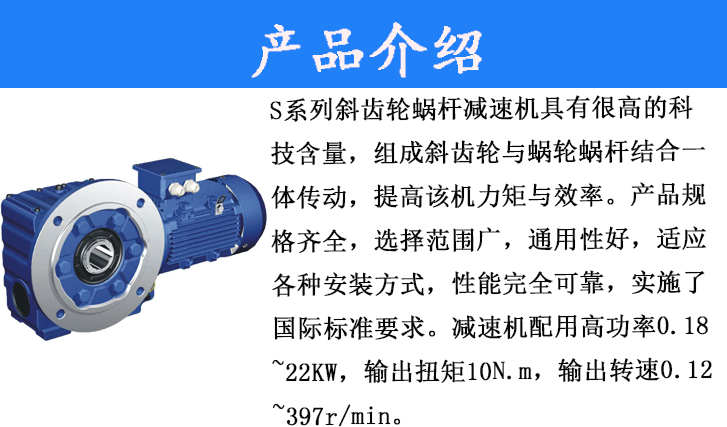S系列齒輪蝸桿減速電機(jī)具有很高的科技含量,有斜齒輪與蝸輪蝸桿結(jié)合一體傳動,提高該機(jī)力矩與效率。該系列產(chǎn)品規(guī)格齊全,轉(zhuǎn)速范圍廣,通用性好,適應(yīng)各種安裝方式,性能安全可靠壽命長,實(shí)施了國際標(biāo)準(zhǔn)要求。減速機(jī)配用高功率0.18~22KW,輸出轉(zhuǎn)距10N.m~4890N.m,輸出轉(zhuǎn)速.12~397r/mino