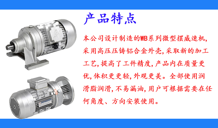 WB系列減速機(jī)具有傳動比大、效率高、體積小、質(zhì)量輕、經(jīng)久耐用、使用可靠、壽命長,可在任何角度任何方向安裝使用等特點(diǎn)。