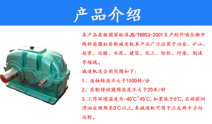 本產(chǎn)品是按國家標準JB/T8853-2001生產(chǎn)的外嚙合漸開線斜齒圓柱齒輪減速機本產(chǎn)品廣泛應用于冶金、礦山、起重、運輸、水泥、建筑、化工、紡織、印染、制造等領域。減速機適合用范圍如下:1,速軸轉速不大于1500轉/分2齒輪傳動圓周速度不大于20米/秒。3.工作環(huán)境溫度為-40℃~45℃,如果低于0℃,啟動前潤滑油應預熱至0℃以上,本減速機可用于正反兩個方向運轉