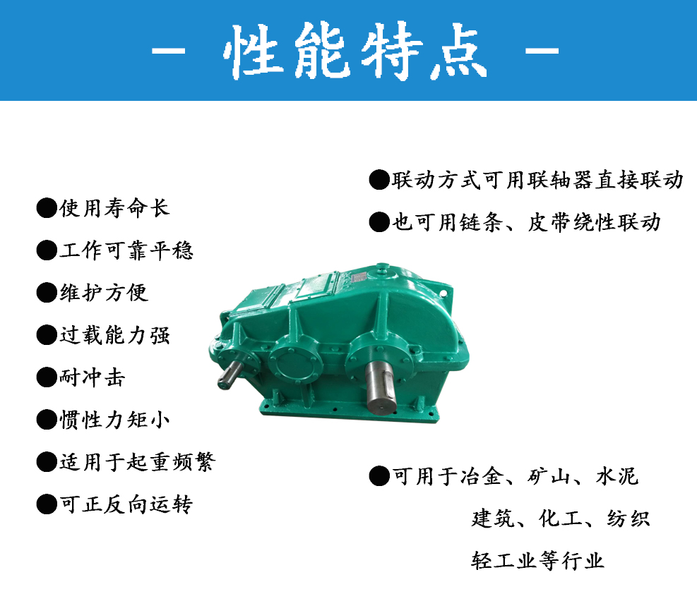 該系列齒輪減速機(jī)使用壽命長(zhǎng),工作可靠,維護(hù)方便。本機(jī)還具有過(guò)載能力強(qiáng),耐沖擊、慣性力矩小,適用于起重頻繁和正、反向運(yùn)轉(zhuǎn)的特點(diǎn)。其聯(lián)動(dòng)方式可用聯(lián)軸器直接聯(lián)動(dòng),也可用鏈條、皮帶撓性聯(lián)動(dòng)主要用于冶金、礦山、水泥、建筑、化工、紡織、輕工業(yè)等行業(yè)。