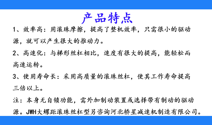 注:①本身無自鎖功能,需外加制動裝置或選擇帶有制動的驅動源。2JWH大螺距滾珠絲杠型另咨詢。