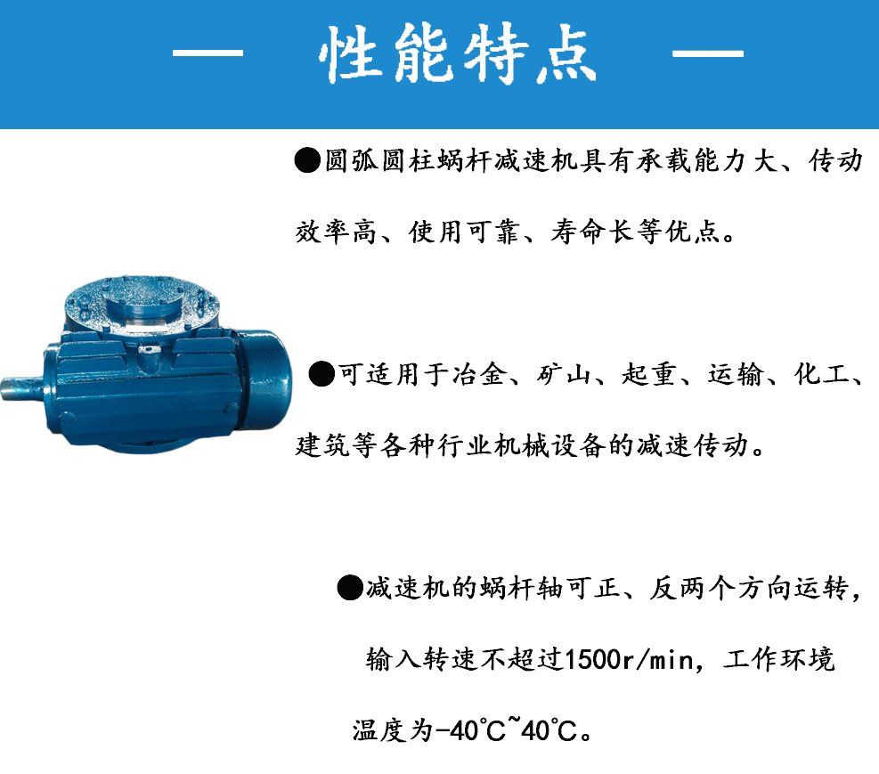 一、概述CW系列圓弧圓柱蝸桿減速器采用單級(jí)蝸桿減速傳動(dòng),符合行業(yè)推薦性標(biāo)準(zhǔn)JB/T7935-95(原國(guó)標(biāo)GB9147-88),此標(biāo)準(zhǔn)達(dá)到國(guó)際九十年代水平。全系列共包括三種型號(hào),16種中心距,12種速比。輸入功率范圍在0.39~189kw之間,輸出扭距在07~13500N·m之間圓弧圓柱蝸桿軸可正、反兩個(gè)方向運(yùn)輸,輸入轉(zhuǎn)速不超過(guò)1500r/min,工作環(huán)境溫度為-40~40℃。當(dāng)工作環(huán)境溫度低于0℃時(shí),起動(dòng)前潤(rùn)滑油必須加熱到0C以上;當(dāng)工作環(huán)境溫度高于40℃時(shí),必須采取冷卻措施。