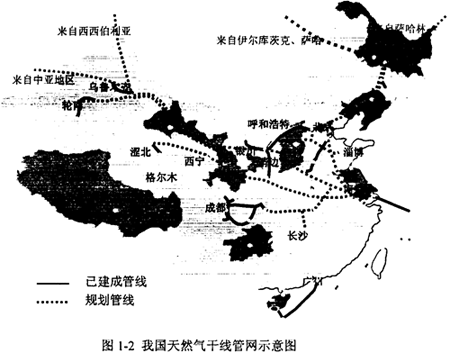 我國(guó)十至十五年內(nèi)天然氣管網(wǎng)建設(shè)的總體規(guī)劃可以概括為“兩橫兩縱”:“兩橫”分別指立足于國(guó)內(nèi)資源的輪南~上海西氣東輸干線,以及為從西部其他國(guó)家引進(jìn)天然氣建設(shè)的第二條新疆~上海輸氣干線:“兩縱”是指從俄羅斯進(jìn)口天然氣,分別建設(shè)東西伯利亞經(jīng)東北至北京,以及薩哈林至沈陽(yáng)輸氣干線,具體線路走向如圖1-2所示。