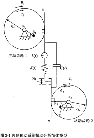 設(shè)有一對齒輪傳動,齒輪1為主動齒輪,齒輪2為從動齒輪,它們分別有一偏心質(zhì)量ml和m2,振動力學(xué)模型見圖2-l。設(shè)主動齒輪的扭轉(zhuǎn)振動角位移、角速度、角加速度和旋轉(zhuǎn)角速度分別為