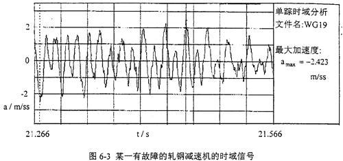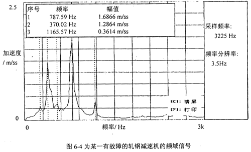 由于減速機(jī)故障樣式的多樣性,故它的故障標(biāo)準(zhǔn)模式樣本的建立是比較困難的,需進(jìn)行大量的試驗(yàn)研究和實(shí)際設(shè)備故障診斷的總結(jié)和歸納。表6-5是在參考其它學(xué)者研究成果的基礎(chǔ)上,總結(jié)設(shè)備具體工作情況得出的減速機(jī)的故障標(biāo)準(zhǔn)模式樣本,表6-6為減速機(jī)標(biāo)準(zhǔn)訓(xùn)練樣本的訓(xùn)練結(jié)果(網(wǎng)絡(luò)規(guī)模為:輸入層節(jié)點(diǎn)數(shù)為:9個(gè);一個(gè)隱層節(jié)點(diǎn)數(shù)為:40個(gè);輸出層節(jié)點(diǎn)數(shù)為9個(gè);誤差精度為10-5,網(wǎng)絡(luò)迭代次數(shù)為5217次)。圖6-3為某一有故障的軋鋼減速機(jī)的時(shí)域信號(hào),圖6-4為頻域信號(hào)。對圖6-4的頻域信號(hào)進(jìn)行歸一化處理,可得待識(shí)別的故障樣本,用訓(xùn)練好的網(wǎng)絡(luò)對該樣本進(jìn)行識(shí)別。表6-7為該減速機(jī)故障樣本的識(shí)別結(jié)果。fa一軸頻,f0一軸承外圈故障特征頻率,fi一軸承內(nèi)圈故障特征頻率,fb一軸承滾動(dòng)體故障特征頻率,fmeh一齒輪嚙合頻率。