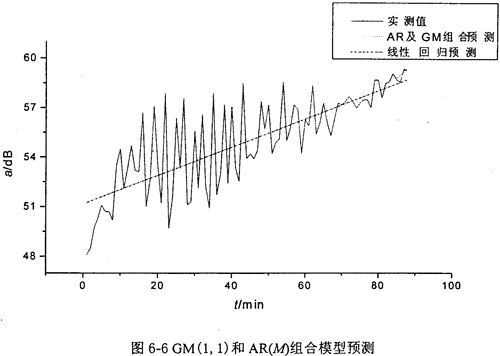表6-9是在某軸承座上測得的振動加速度信號,經(jīng)檢驗該時間序列為一個非平穩(wěn)序列,現(xiàn)用GM(1,1)和AR(M)組合模型預(yù)測第85至第88個數(shù)據(jù)點,預(yù)測結(jié)果見圖6-6。預(yù)測誤差最大點為1.7%,最小點為0.33%。圖6-6中還畫出了有線性回歸模型預(yù)報的結(jié)果,預(yù)報誤差最大達2.23%。