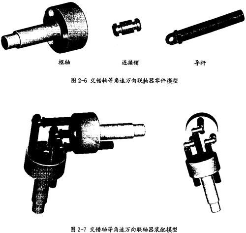 利用圖2-5中的機(jī)構(gòu)形式,將其在空間中進(jìn)行擴(kuò)展,即可得到一種非常有價值的等角速萬向聯(lián)軸器——RCRCR交錯軸等角速萬向聯(lián)軸器。在圖2-6示意了此種聯(lián)軸器的組成零件模型,在圖2-7中示意了此種聯(lián)軸器的裝配模型,其中左右兩圖分別是從不同的視角得到的視圖。這種聯(lián)軸器在功能上能實現(xiàn)空間交錯軸傳動,它的主要特點(diǎn)是:低副結(jié)構(gòu),耐磨損性好;構(gòu)件形狀簡單,便于制造;允許被聯(lián)接的兩交錯軸的偏移角變動范圍大,甚至可作直角交錯傳動(不考慮構(gòu)件間干涉時)。