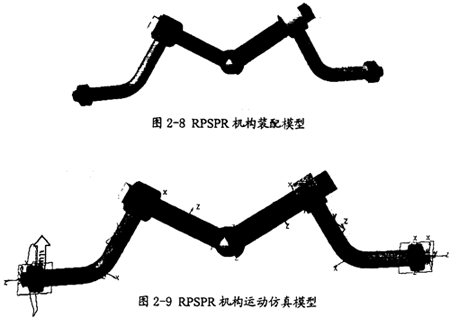 在圖2-8所示模型的基礎(chǔ)上,通過在各構(gòu)件間加上運(yùn)動副,在運(yùn)動副上施加運(yùn)動驅(qū)動,即可得到此機(jī)構(gòu)的運(yùn)動仿真模型(如圖2-9所示)。在此模型的建立過程中嚴(yán)格保證各構(gòu)件的共面,其運(yùn)動副的形式同圖2-2中的RPSPR機(jī)構(gòu)均相同。這樣在此模型中有4個構(gòu)件(不含機(jī)架)、有2個旋轉(zhuǎn)副、有2個移動副、有l(wèi)個球面副、模型有l(wèi)個自由度,再加上l個運(yùn)動驅(qū)動即可得到完整的仿真模型。不過此模型并不滿足鏡面機(jī)構(gòu)的條件。