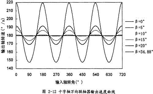 十字軸萬向聯(lián)軸器的機(jī)構(gòu)實(shí)際上是球面四連桿機(jī)構(gòu),它的空間運(yùn)動(dòng)關(guān)系早已解析出。當(dāng)輸入、輸出兩軸線的夾角為β輸入軸轉(zhuǎn)角фi轉(zhuǎn)速ωi,輸出軸轉(zhuǎn)角фo,轉(zhuǎn)速ωo,則它們的位移關(guān)系式為:tgфi=tgф0cosβ,速度關(guān)系式為: