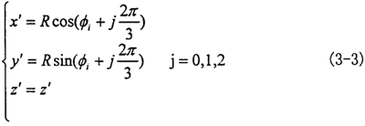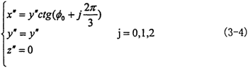 故三叉桿軸頸的軸線方程由坐標(biāo)系O″X″Y″Z″轉(zhuǎn)到坐標(biāo)系O′X′Y′Z′為: