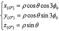 ≈0,cosθ≈1(實際上p<<L,近似處理是合理的),則可得到三小桿的球面中心P在固定坐標(biāo)系O′X′Y′Z′中的運動軌跡: