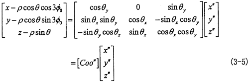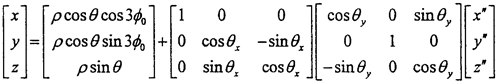 由于動坐標(biāo)系O″X″Y″Z″的O″Y″軸取得始終垂直于固定坐標(biāo)系OX軸,可認(rèn)為先把OXYZ坐標(biāo)系繞OX軸轉(zhuǎn)過夾角θx,使OY軸與O″Y″軸平行,再繞新的OY軸轉(zhuǎn)過θy,使OX軸與O″X″軸平行,OZ軸也同時平行于O″Z″軸(變換空間位置如圖3-6所示)。則固定坐標(biāo)OXYZ與動坐標(biāo)系間的變換關(guān)系如下: