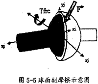 球面副產(chǎn)生摩擦的示意圖如圖5-5所示。在這種運(yùn)動副中只會產(chǎn)生逆向于旋轉(zhuǎn)方向的摩擦扭矩Tfrc(如圖5-5中紅色箭頭所示),它的產(chǎn)生只有一種因素,即構(gòu)件間相互作用的徑向力F(如圖5-5中灰色箭頭所示)。在施加由相互作用的徑向力F產(chǎn)生的摩擦力時,要考慮徑向力F的大小和球半徑,另外還得考慮靜摩擦系數(shù)、動摩擦索數(shù)及預(yù)載荷的作用。