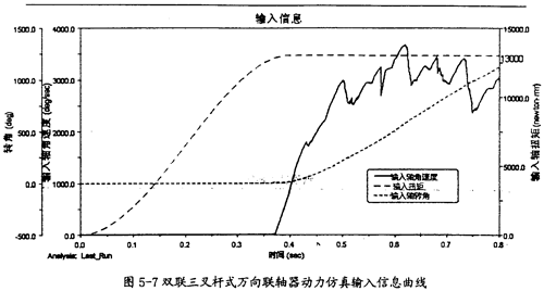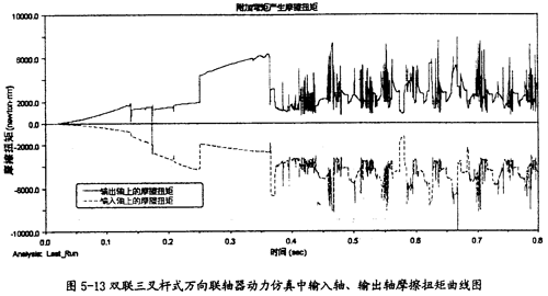 由圖5-12可以看出,雙聯(lián)三叉桿式萬向聯(lián)軸器在動力仿真的過程中,其一端的三個(gè)小桿所受的摩擦力的合力變動較有規(guī)律,其值在開始一段平滑,其后幾乎以0為中心波動。由于這三個(gè)摩擦力的方向均平行于輸入軸或輸出軸軸線,故此合力會在輸入軸和軸出軸上產(chǎn)生軸向的力,在輸入軸和輸出軸上產(chǎn)生摩擦扭矩。如取其水平較高值60牛來計(jì)算,它產(chǎn)生的摩擦扭矩為270N·mm(60×0.3×15=270,其中0.3為動摩擦系數(shù),15為摩擦半徑),此值相對圖5-13中的值而言相當(dāng)小。