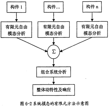 通過對系統(tǒng)中的各構(gòu)件進(jìn)行有限元自由模態(tài)分析,得到各構(gòu)件的自由模態(tài)(當(dāng)然也包含了6個剛體模態(tài)),以各構(gòu)件的連接關(guān)系為依據(jù),建立邊界條件,然后進(jìn)行模態(tài)綜合,即可計(jì)算得到整個系統(tǒng)的動特性和響應(yīng)。其過程如圖6-2。