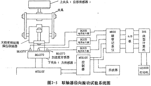 由于常規(guī)的激勵(lì)方式無法滿足鋼絲繩聯(lián)軸器振動(dòng)試驗(yàn)的要求,我們不得不另辟途徑。MTS材料試驗(yàn)機(jī)一般用于材料的應(yīng)力應(yīng)變、強(qiáng)度以及疲勞試驗(yàn),其位移一般不超過1毫米,但此材料試驗(yàn)機(jī)具有往復(fù)運(yùn)動(dòng)的功能,因此嘗試?yán)盟鳛榧ふ衿,對大撓度彈性?lián)軸器進(jìn)行振動(dòng)試驗(yàn),試驗(yàn)系統(tǒng)如圖2-5所示。MTS試驗(yàn)機(jī)主要由機(jī)架、上下夾頭、油缸活塞和控制器等組成?刂破髂芫_地控制試驗(yàn)機(jī)上下夾頭往復(fù)運(yùn)動(dòng)的頻率、振幅和振動(dòng)位移的波形。彈性聯(lián)軸器由我們專門設(shè)計(jì)的夾具與MTS試驗(yàn)機(jī)的上下夾頭相連接,夾具保證聯(lián)軸器在徑向振動(dòng)時(shí),所受拉壓力的作用線與彈性聯(lián)軸器在受力方向上的對稱幾何中心線重合。