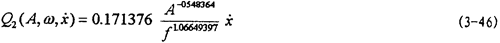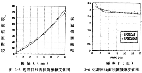 對于(3-22)模型,我們用阻尼耗能的能量關(guān)系來辨識阻尼力與振幅和頻率的關(guān)系。在前面,遲滯回線面積(即阻尼耗能)與振幅的函數(shù)關(guān)系已建立起來,見(3-38)式,而且式中參數(shù)也已辨識出。同樣,用數(shù)值積分,可以算出振幅一定,頻率變化時遲滯回線的面積,由此得出遲滯回線面積與頻率的對應(yīng)關(guān)系,將這些對應(yīng)關(guān)系畫成曲線如圖3-6中大圓點曲線所示。由遲滯回線面積隨頻率變化的規(guī)律分析,可建立其函數(shù)關(guān)系為: