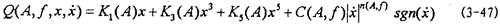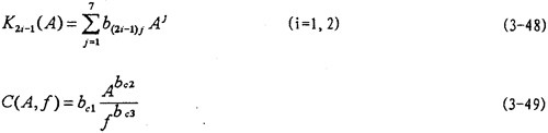 的函數(shù),或者說恢復(fù)力Q是剛度函數(shù)K1(A),K3(A),K5(A)和阻尼函數(shù)C(A,f)以及阻尼成分函數(shù)n(A,f)的函數(shù),其中阻尼成分函數(shù)n(A,f)描述阻尼的組成情況,n(A,f)=0時,阻尼為干摩擦阻尼,n(A,f)=1時,為粘性阻尼,0<n(A,f)<1時,阻尼由粘性阻尼和干摩擦阻尼組成,n(A,f)>1時,阻尼成為“高階”阻尼。對于(3-47)式,當振幅與頻率一定時,式中的Kl(A),K3(A),K5(A)和n(A,f)均為定數(shù),當振幅A和頻率變化時,它們均是函數(shù),因此參數(shù)辨識實質(zhì)上是參數(shù)函數(shù)的辨識。首先我們用非線性參數(shù)辨識方法Marquardt法,根據(jù)試驗所得的數(shù)據(jù),按照(3-47)式對每一遲滯回線進行參數(shù)辨識,可以得到對應(yīng)的K1(A),K3(A),K5(A),C(A,f)和n(A,f)值,對每種工況下的數(shù)據(jù)隨振幅和頻率變化趨勢進行分析后,可以建立剛度函數(shù)、阻尼函數(shù)和阻尼成份函數(shù)的數(shù)學表達式為: