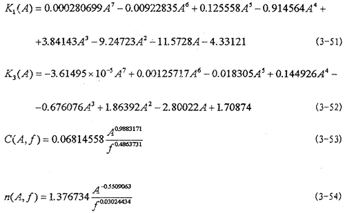 然后用線性參數(shù)辨識法和非線性參數(shù)辨識法,根據(jù)上面已經(jīng)得到的各個工況下K1(A),K3(A),K5(A),C(A,f)和n(A,f)的數(shù)值對(3-48)、(3-49)、(3-50)式中各參數(shù)進行辨識,將辨識得到各參數(shù)代入(3-48)、(3-49)和(3-50)式得: