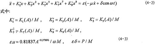 目前文獻(xiàn)上的一些方法對于弱非線性系統(tǒng)是有效的,而對于(4-2)式的強(qiáng)非線性系統(tǒng)則遇到了麻煩。由于描述非線性振動系統(tǒng)的微分方程種類繁多,沒有普遍的解法,因此,仍然只有極少非線性振動方程可求得精確解?尚械霓k法是針對不同非線性振動方程的特點(diǎn)尋求一些近似數(shù)值解法。為研究方便,將(4-2)式進(jìn)一步寫成以下形式: