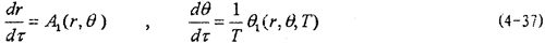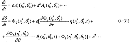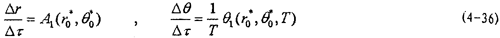 這就是對應(yīng)于(4-2)式的頻閃差分方程,即(4-2)式在Poicare平面上以T為周期的點變換方程。如ε充分小,則可令△τ=dτ,△r=dr,△θ=dθ,此外,(4-36)中的