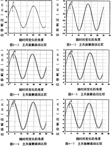 =2時(shí)兩者的重合性很好。(2).隨著振幅的增大,解析解曲線1和仿真解曲線2在相位上產(chǎn)生微小變化,解析解的相位超前仿真一個(gè)小量,原因是隨著振幅的增大,系統(tǒng)呈現(xiàn)更為強(qiáng)烈的非線性,而在推導(dǎo)中略去了高次項(xiàng),但還是可以滿足工程的要求。(3)從(4-78)-(4-85)式中的各δ值可知,在聯(lián)軸器產(chǎn)生主共振的情況下,激振力很小。