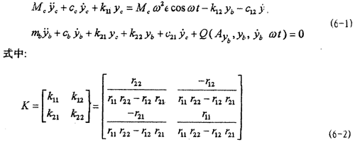 b= d2yb/dt2,分別為聯(lián)軸器從動端質(zhì)量塊mb在y軸方向的位移、速度和加速度。k11,k 12,k 21,k 22為轉(zhuǎn)軸的剛度系數(shù),cc,cb,c12,c21為轉(zhuǎn)軸的阻尼系數(shù),Q為聯(lián)軸器恢復(fù)力。Mc=mc+ms,ms為轉(zhuǎn)軸及軸套的質(zhì)量,mc為圓盤的質(zhì)量,ω為轉(zhuǎn)軸的角速度。