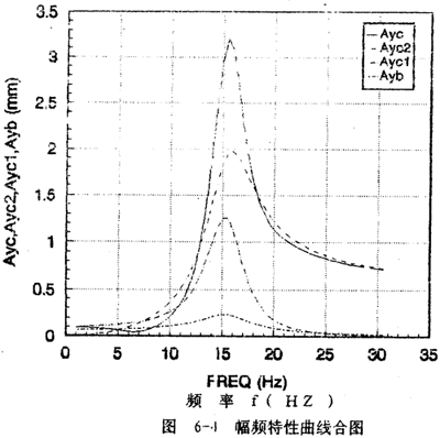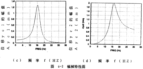 yc2的幅頻特性如圖6-2(d)所示。Ayc2從1赫茲開始隨頻率的增大而迅速增大,在軸系的二階固有頻率15.56赫茲處達(dá)到最大值,然后隨頻率增大而減小并趨于某一定值,Ayc2隨頻率變化的規(guī)律反映圓盤僅在質(zhì)量偏心激勵下,而軸系沒有鋼絲繩聯(lián)軸器影響時圓盤的幅頻特性?紤]上聯(lián)軸器對圓盤幅頻特性的影響部分Ayc1(圖6-2(c)所示部分),則圓盤的幅頻特性即為圖6-2(a)所示。由此可見,鋼絲繩聯(lián)軸器在頻率的較低段(0~11赫茲)對圓盤振動有抑制作用。值得一提的是Ayc不是Ayc1和Ayc2的簡單相加,而與各頻率對應(yīng)的向量{a}中17個元素以及相位有關(guān)。