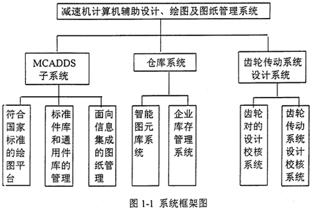 減速機(jī)計(jì)算機(jī)輔助設(shè)計(jì)、繪圖及圖紙管理系統(tǒng)主要包括MCADDS子系統(tǒng)和齒輪傳動(dòng)系統(tǒng)的設(shè)計(jì)系統(tǒng)和信息管理系統(tǒng)三部分(見圖1-1),其中MCADDS子系統(tǒng)實(shí)現(xiàn)高效繪圖;齒輪傳動(dòng)系統(tǒng)的設(shè)計(jì)系統(tǒng)快速精確的實(shí)現(xiàn)產(chǎn)品設(shè)計(jì);而信息管理系統(tǒng)將提高企業(yè)的信息管理與控制,提高資源利用率。