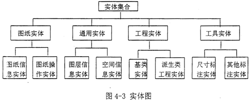 在面向?qū)ο蟮腃AD集成開發(fā)系統(tǒng)里,系統(tǒng)數(shù)據(jù)模型的基本元素就是ARX開發(fā)語言中的(多是C/C++語言)類,類實例化后稱為對象或?qū)嶓w,整個圖紙就是一個實體集合,主要由四大塊組成:圖紙實體集合、通用實體集合、工程實體集合和工程實體集合。其中,圖紙實體、通用實體和工具實體都為獨立類,沒有父類或子類;而工程實體集合中的各工程實體是由具有基本特征的基類實體派生而來,具有一個基類和若干個派生類,并且各實體集之間互相獨立(如圖4-3所示)