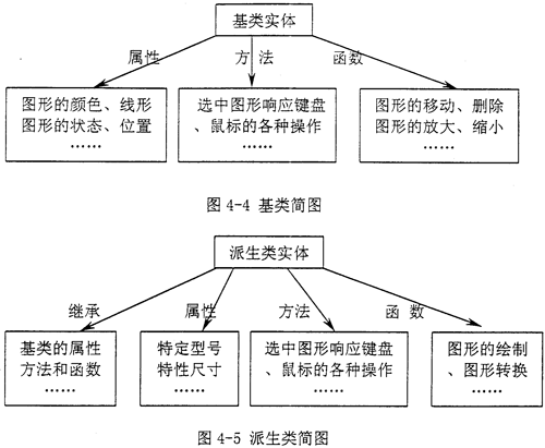 對于以上的問題,第一,要對行業(yè)的需求十分清晰,能夠?qū)π袠I(yè)中涉及到的工程實體進行歸納,要具有“面向?qū)ο蟆钡木幊趟季S;第二,基類涉及的屬性方法和函數(shù)基本上與實體圖形的操作有密切關(guān)系(如圖4-4所示);派生類主要涉及到工程實體的特征屬性、特征方法和特征函數(shù)(如圖4-5示),完整地定義其基類和派生類是“面向?qū)ο蟮腃AD集成開發(fā)系統(tǒng)”中的核心部分;第三,要充分的利用AutoCAD已提供的資源,主要就是要利用AutoCAD系統(tǒng)中的*,dwg文件的圖形文件數(shù)據(jù)庫中的資源,熟悉各種AutoCAD中實體(例如點、直線、圓弧等)的DXF碼規(guī)則,并從中提取相關(guān)特征信息;第四,由于在AutoCAD中的.dwg文件中,存儲的是一些簡單的幾何的點、直線、圓、弧等信息,故還需要另一個文件去記錄整個圖紙的工程實體圖形的邏輯關(guān)系(下一節(jié)詳細介紹),隨同*.dwg文件的打開而打開,標(biāo)識*.dwg文件圖形中的實體圖形邏輯關(guān)系,隨同*.dwg文件的關(guān)閉而記錄*.dwg文件中的實體圖形邏輯關(guān)系。