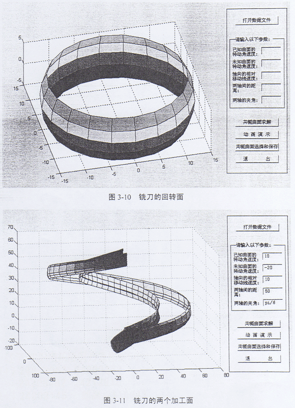 (1)本章充分利用MATLAB的計(jì)算特點(diǎn)來處理數(shù)字化共軛曲面的求解及仿真,用一維數(shù)組、二維數(shù)組、三維數(shù)組分別與點(diǎn)的運(yùn)動軌跡、曲面、曲面族相對應(yīng);用坐標(biāo)分解的方法使MATLAB可以方便地處理三維曲面;