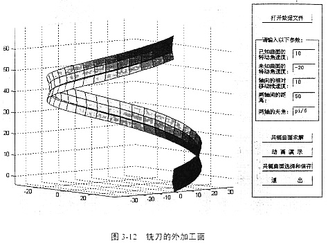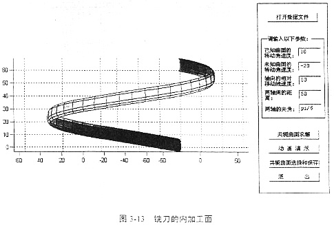 借助于軟件Conjugater1.0求銑刀加工的過程與求解軋輥曲面的過程相同。輸入輸出界面和結(jié)果如圖3-10、圖3-11、圖3-12、圖3-13所示。最后得到如圖的兩個螺旋面,這兩個螺旋面都是滿足共軛條件的,圖3-12表示銑刀在工件實(shí)體的外圓加工所得的曲面,圖3-13表示銑刀在工件的內(nèi)壁加工所得的曲面。應(yīng)用時(shí)可根據(jù)實(shí)際情況選取。