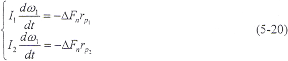 如果在t=0的瞬時,由于干擾載荷的作用,輪齒的變形量增大△δ,則齒上的載荷也獎增加△Fn,當轉矩M1、M2為定值時,由齒輪的平衡條件可知,齒輪的角速度ω將發(fā)生周期性變化,而載荷和變形也以同一頻率變化。由(5-17)式和(5-18)式,得