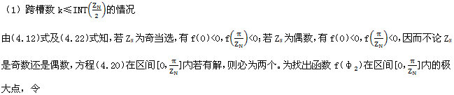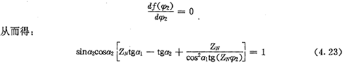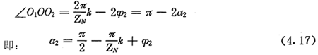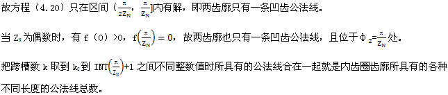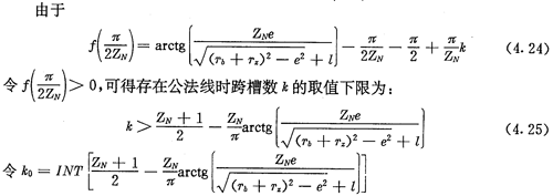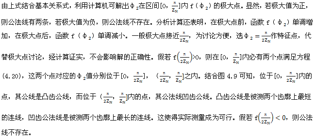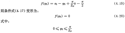 上式就是齒廓AB上與跨槽數(shù)為k的齒廓具有公法線的點(diǎn)的條件。當(dāng)k確定后,若存在公法線,則由(4.17)式并結(jié)合基本關(guān)系式(2.38)等可解出φ2的值來。