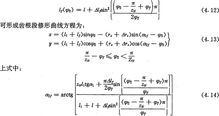 顯然,未經(jīng)修形的齒廓曲線在齒頂鄰域和齒根鄰域嚙合的壓力角都很小,因而分段修形后應(yīng)將頂、根部大致削去相同的區(qū)段。即φa、φf仰的分配應(yīng)根據(jù)各自所對(duì)應(yīng)的頂根段曲線弧長相等的原則來進(jìn)行。一般可近似取φa為φf的2到4倍,而取△la=△lf=esinφa。