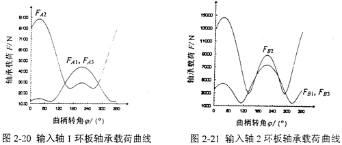 L1=145mm,L2=145mm,Z1=42,Z2=44,m=3.5mm,α=20°,α′=37.356°,T=875N·m,n=1440r/min,b1=19mm,b2=38mm。則兩輸入軸的偏心軸頸上的環(huán)板軸承載荷FAi、FBi隨輸入曲柄轉角φ變化的曲線如圖2-20、2-21所示。