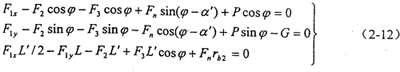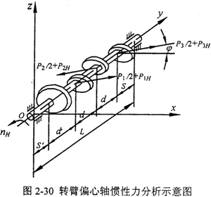 一級輸出二級輸入軸上的慣性力大小及方向如圖2-30所示,假設慣性力與x軸正向所成的角度為φ,則轉臂偏心軸上的慣性力矢量和為: