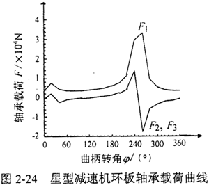 L=112.5mm,L′=129.9mm,Z1=42,Z2=44,m=3.5mm,α=20°,α′=37.356°,n=1440r/min,T=300N·m,b=20mm。則輸入軸、兩個支承軸的偏心軸頸上的環(huán)板軸承載荷F1、F2、F3隨輸入曲柄轉角φ變化的曲線如圖2-24所示。