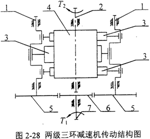 三環(huán)減速機是為適應現(xiàn)代機械設備對傳動機構的新要求而開發(fā)的一種以漸開線少齒差行星齒輪傳動原理工作的新型傳動裝置,本文所研究的三環(huán)減速機傳動結構如圖2-28所示,它由兩根二級高速偏心輸入軸1,低速輸出軸2,三片內齒環(huán)板(兩塊兩側環(huán)板3和一塊中間環(huán)板3′)和外齒輪4構成。三片內齒環(huán)板偏心安裝在兩根高速軸上1上,為了克服二級偏心輸入軸的死點位置和增大傳動比,采用兩個分流定軸齒輪5分別帶動兩個偏心輸入軸,而齒輪5則由一級輸入軸7上的主動齒輪6帶動。三個內齒環(huán)板偏心之間的相位差為π,并且考慮慣性力平衡,中間環(huán)板的厚度取為兩側環(huán)板厚度的2倍,它們都與外齒輪4相嚙合,外齒輪4安裝在輸出軸2上,各軸均平行配置。