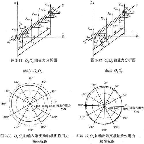 由上述受力分析可知:輸出端支承軸承作用力比輸入端支承軸承作用力大,可見一級傳動對箱體支承軸承的貢獻不大,主要還是二級傳動的作用。因此在第五章中,選取輸出端軸承座作為測振點。OAOA′軸輸出端支承軸承作用力比OBOB′軸輸出端支承軸承作用力、作用力波動幅度略大,主要是由于一級傳動和考慮變形協(xié)調條件的影響而致,且周期都為2π,這是OAOA′軸輸出端軸承座振動比OBOB′軸輸出端軸承座振動略大的原因。