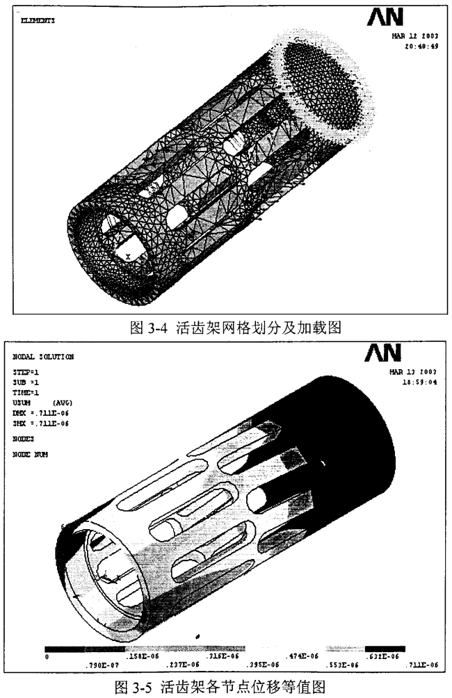 3.3.2.1 活齒架的強(qiáng)度分析 采用平臺(tái)為Pentium IV 1.7GHz CPU 、128MDDR SDRAM內(nèi)存、NVIDIA Geforce2 MX/MX4OO顯卡、Windows XP操作系統(tǒng)和ANSYS5.7 軟件進(jìn)行分析求解。