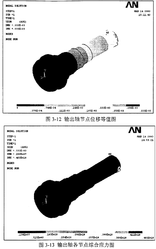 同樣,輸出軸劃分網(wǎng)格并加載后見圖3-11,各節(jié)點(diǎn)位移圖和綜合應(yīng)力圖分別見圖3-12和圖3-13。查詢可知輸出軸了大位移在節(jié)點(diǎn)49處,位移值為0.333mm。平均綜合應(yīng)力為1.5MN/mm2,遠(yuǎn)小于許用應(yīng)力。